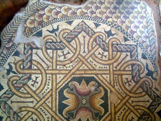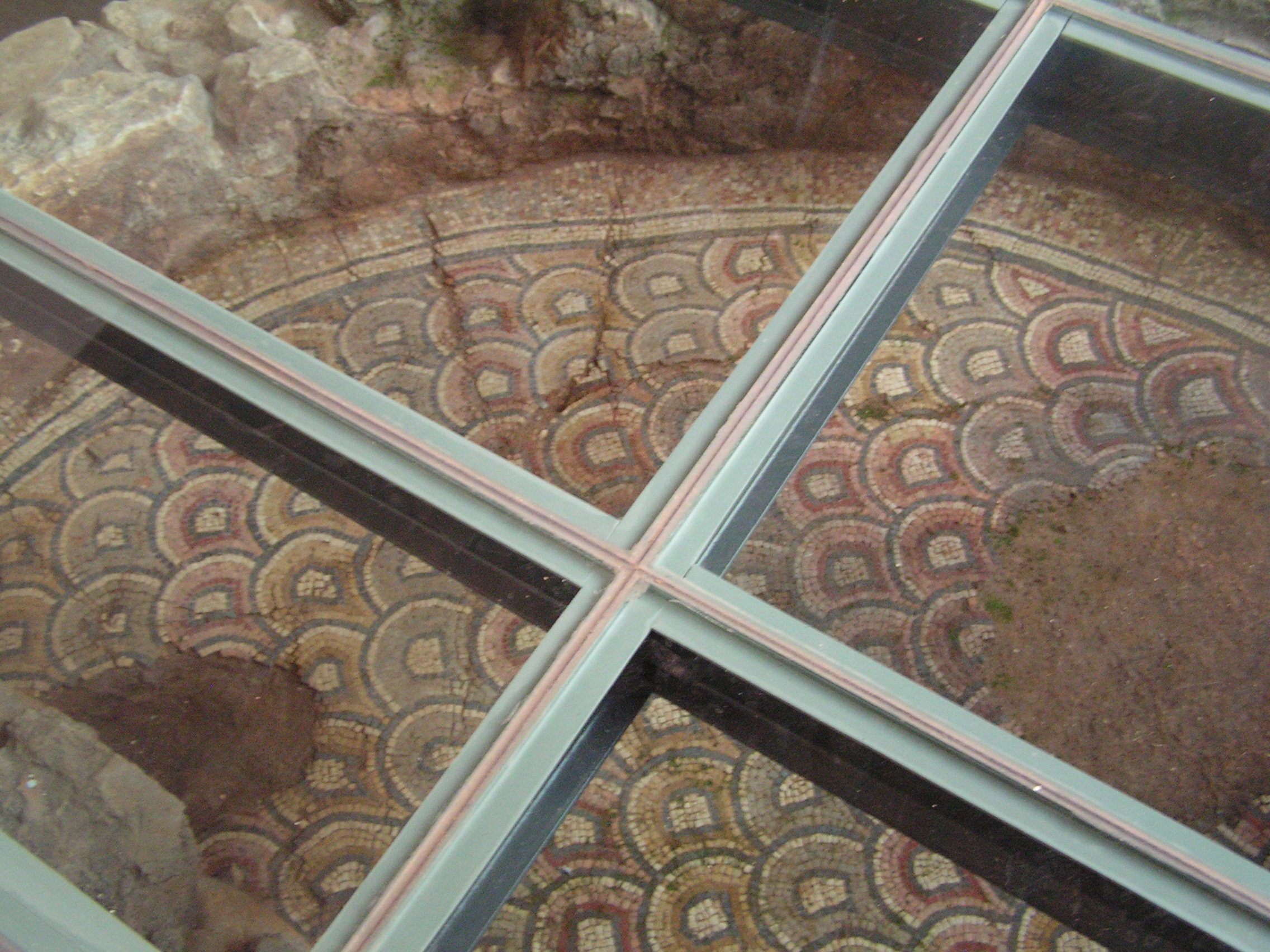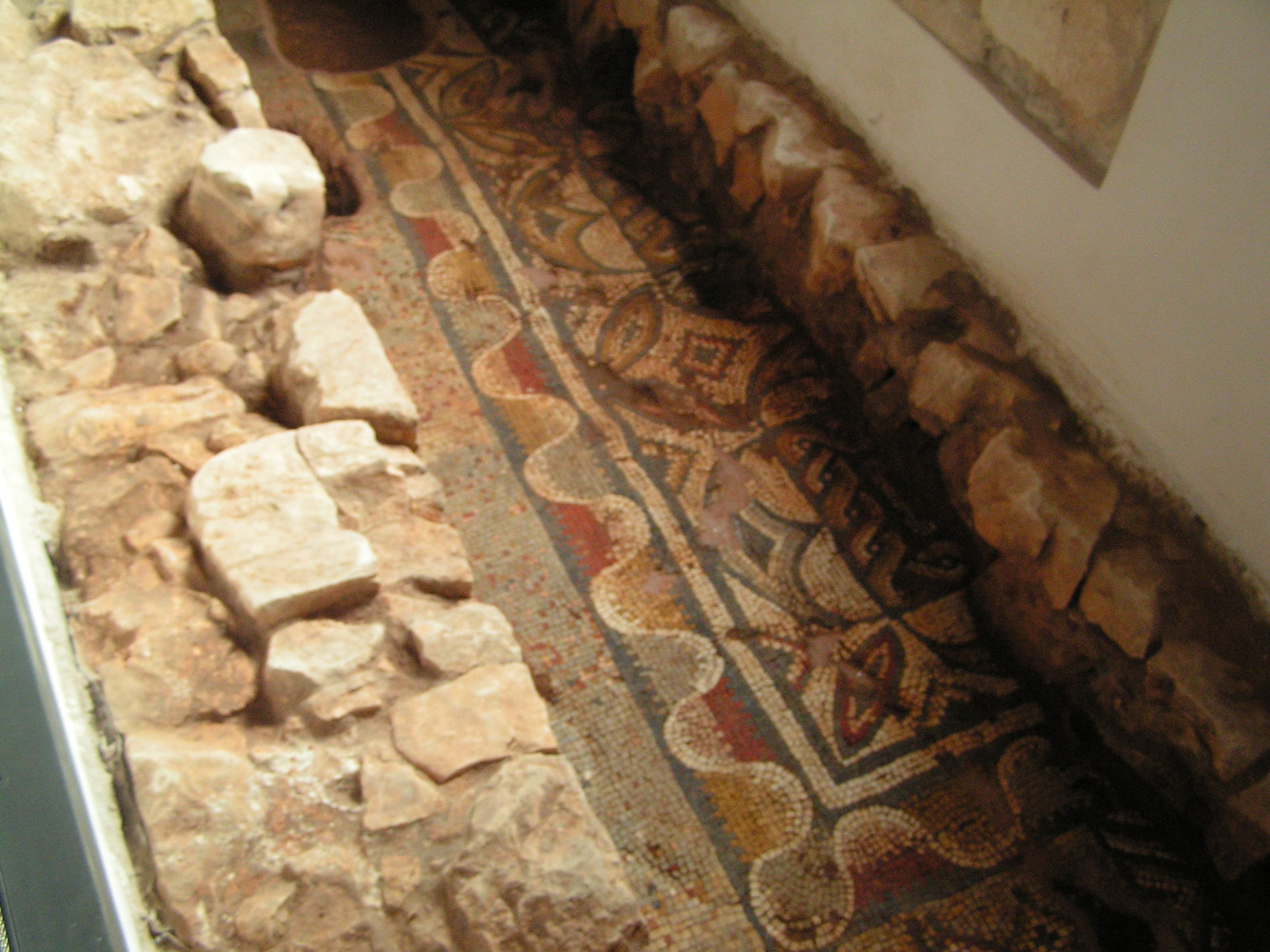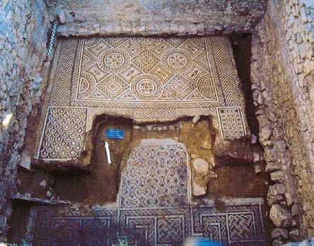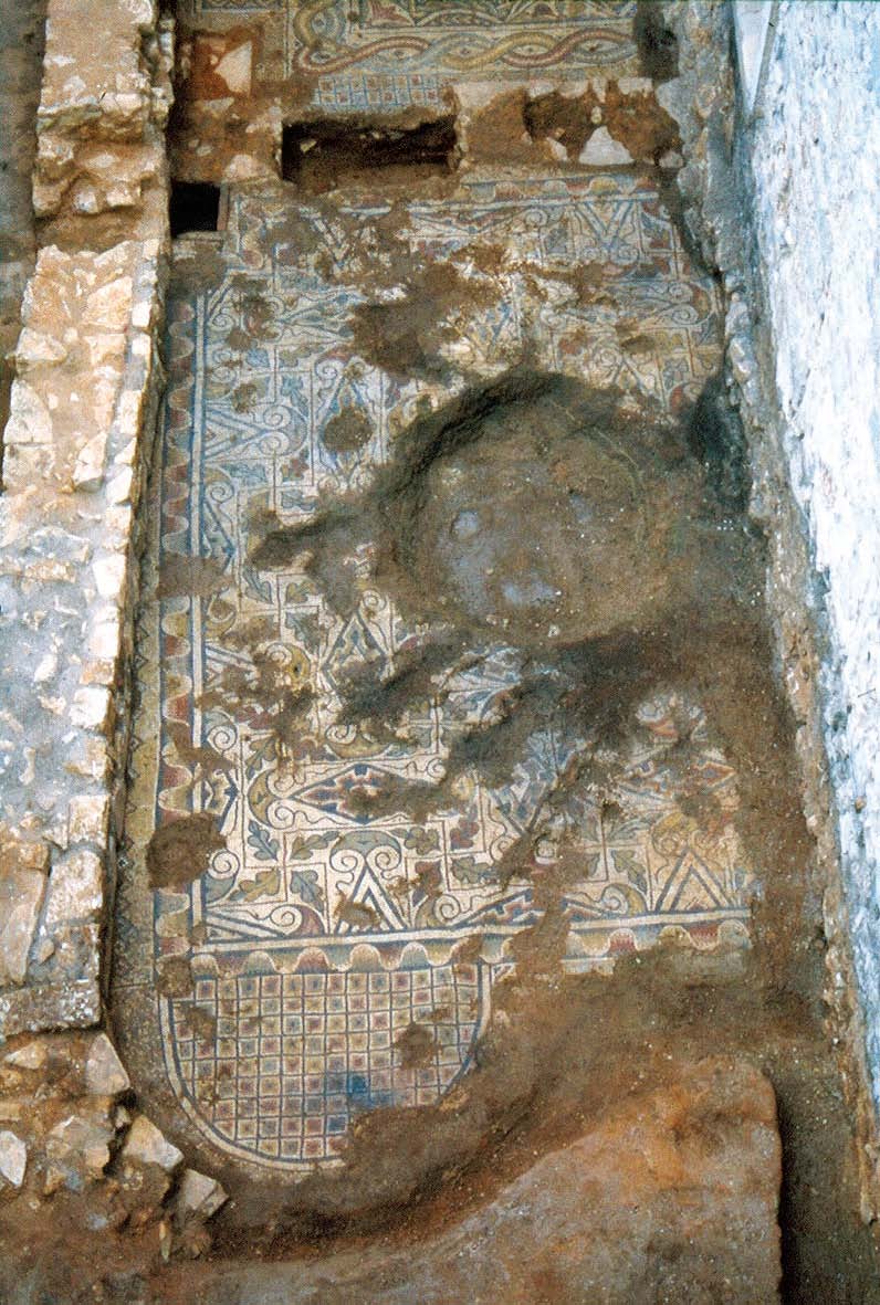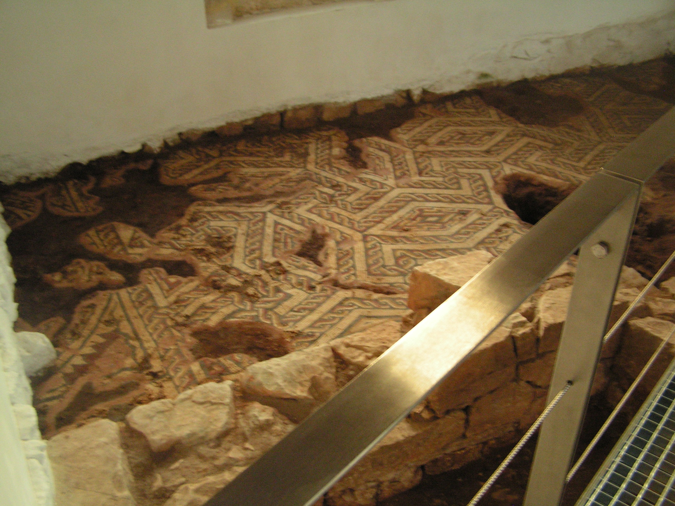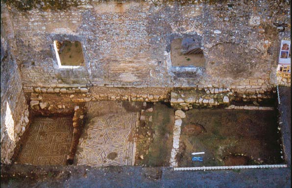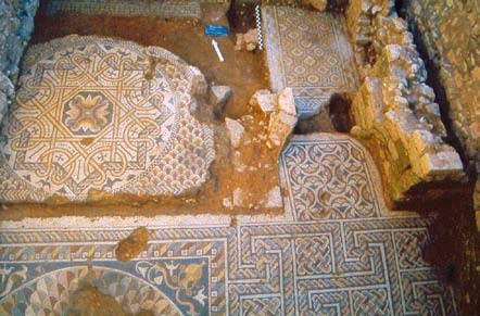 Paço dos Vasconcelos, villa tardo-romana, zona noroeste do grande corredor (áreas A e J). A proposta apresentada fundamenta-se na análise dos pavimentos musivos, na selecção de alguns materiais recolhidos em estratigrafia, nomeadamente a colecção de moedas dos séculos IV-V, e na classificação de alguns fragmentos de Os pavimentos musivos da Guarda inserem-se no último dos três grandes períodos dos mosaicos na Península Ibérica decoração em tudo semelhante à utilizada na Rabaçal, no concelho de Penela, cujos mosaicos estão datados de finais do século IV ou inícios do V como nas demais Ibérica. Ali está presente o geometrismo como característica principal da decoração daquele período, denotando-se um certo barroquismo, patente nas composi&cced |